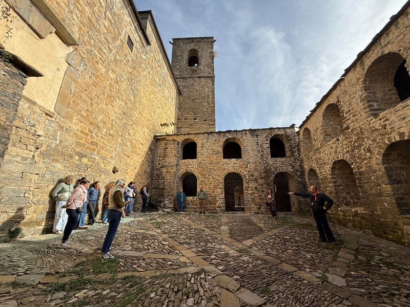 Mª Pilar Ara, técnica de promoción de la Comarca de Sobrarbe, ha hecho las veces de anfitriona conduciendo al grupo por los diversos espacios, entre los que también estaban la sede del Geoparque, las oficinas de turismo de Boltaña, Bielsa, Tella y Plan, y el Monasterio de San Victorián, uno de los emblemas del territorio.
