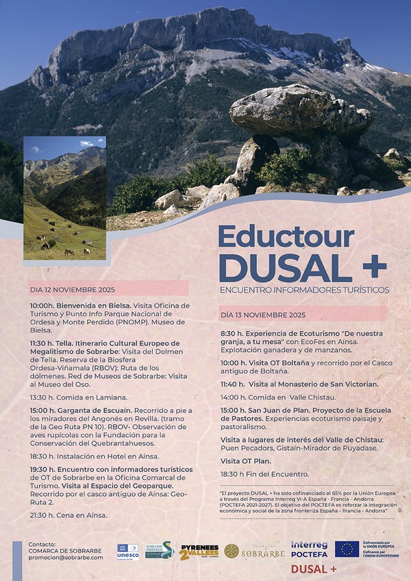 Estas jornadas han salido adelante con la colaboración de ayuntamientos, personal de las oficinas de turismo municipales y de las informativas del Parque Nacional de Ordesa y Monte Perdido, así como personal de la Reserva de la Biosfera Ordesa-Viñamala, del Geoparque Mundial Sobrarbe- Pirineos y de la Fundación para la Conservación del Quebrantahuesos, sin olvidar a las oficinas de turismo francesas. Tal y como concluía la técnica de promoción sobrarbense, «jornadas como las vividas demuestran que la cooperación trasciende el papel, generando momentos reales de convivencia que nos permiten seguir avanzando en el propósito final del Dusal+: construir conjuntamente el destino de valor excepcional que somos«.