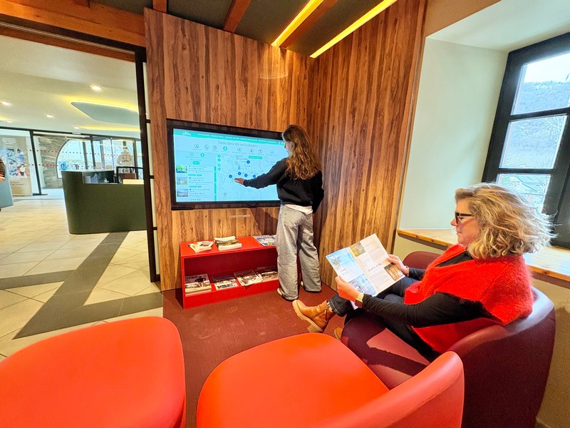 Desde la entrada, el lugar se presenta luminoso y acogedor. Los deportes al aire libre y las experiencias en plena naturaleza ocupan un lugar central. Pantallas táctiles interactivas permiten explorar fácilmente, y de forma autónoma, las actividades, eventos e ideas de estancia. El ámbito transfronterizo también está puesto en valor, con un mapa del territorio Aure Louron Sobrarbe y varias ideas de visitas a pueblos del Sobrarbe presentadas en la revista de destino.